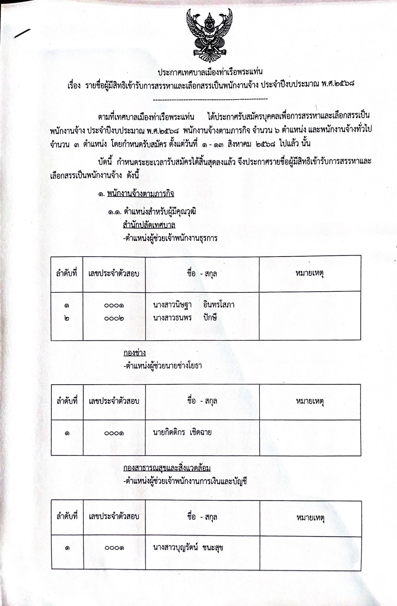 รายชื่่อผู้มีสิทธิเข้ารับการสรรหาและเลือกสรรเป็นพนักงานจ้าง ประจำปีงบประมาณ 2568