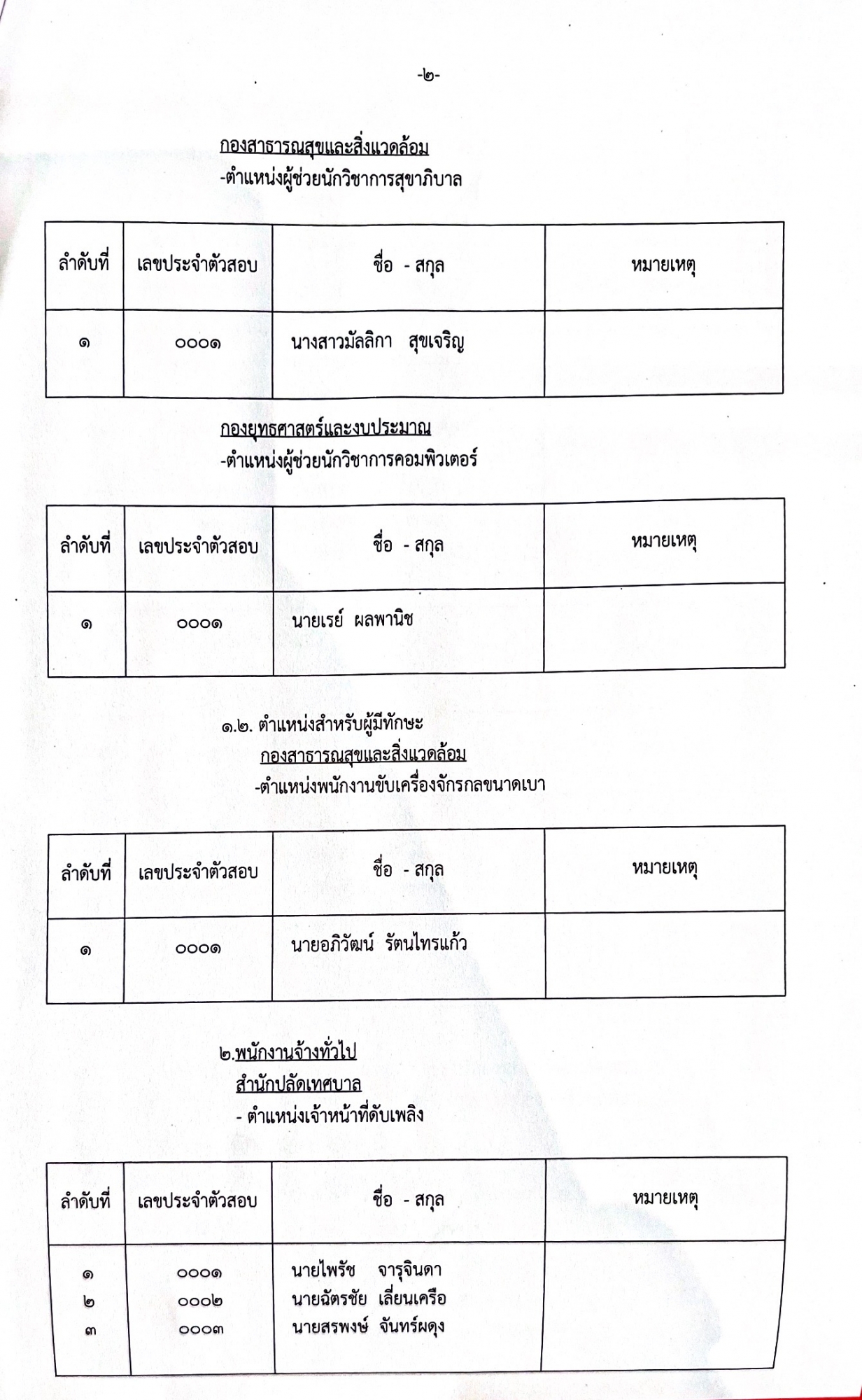 ประกาศรายชื่อผู้สอบผ่านภาคความรู้ความสามารถทั่วไป (ภาค ก) และภาคความรู้ความสามารถที่ใช้ เฉพาะตำแหน่ง (ภาค ข) การสอบคัดเลือกพนักงานเทศบาลเพื่อเปลี่ยนสายงานผู้ปฏิบัติให้ดำรงตำแหน่งต่างสายงาน ประเภททั่วไปเป็นประเภทวิชาการ
