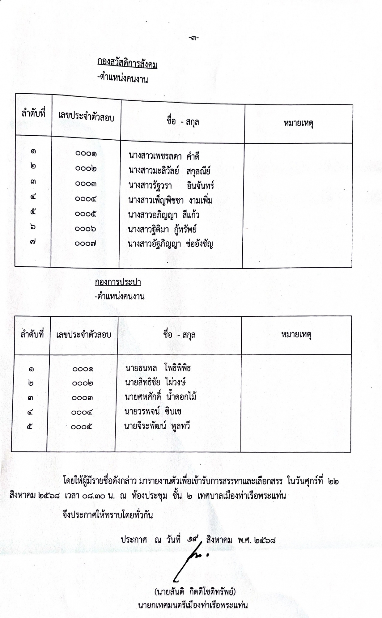 ประกาศเทศบาลเมืองท่าเรือพระแท่น เรื่อง ประกาศรายชื่อผู้มีสิทธิเข้ารับการสอบคัดเลือกพนักงานเทศบาลเพื่อเปลี่ยนสายงานผู้ปฏิบัติ ให้ดำรงตำแหน่งต่างสายงาน ประเภททั่วไปเป็นประเภทวิชาการ